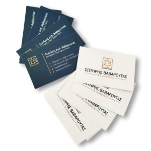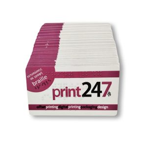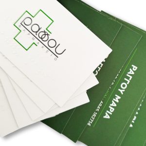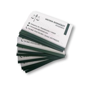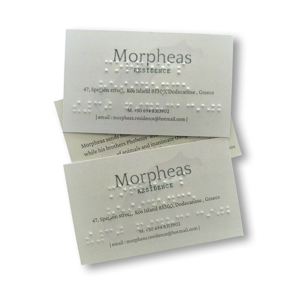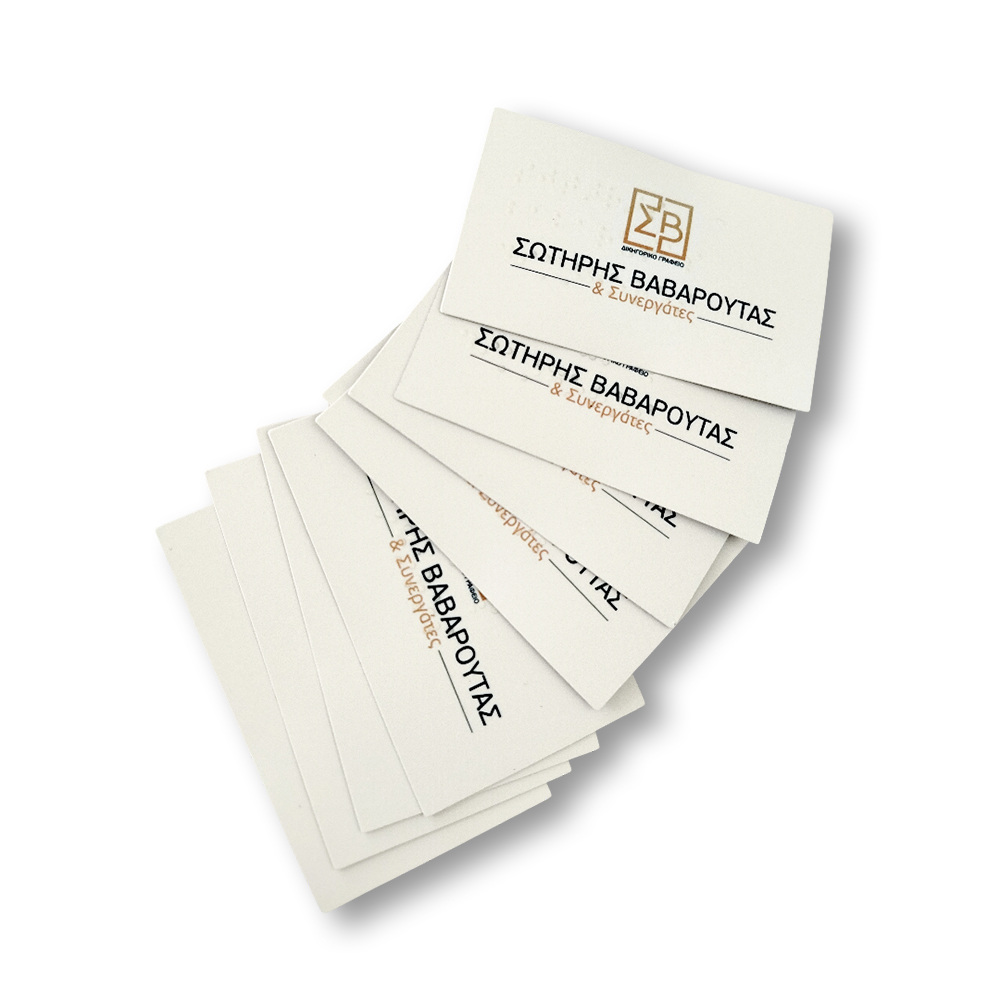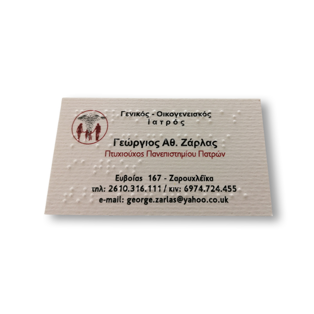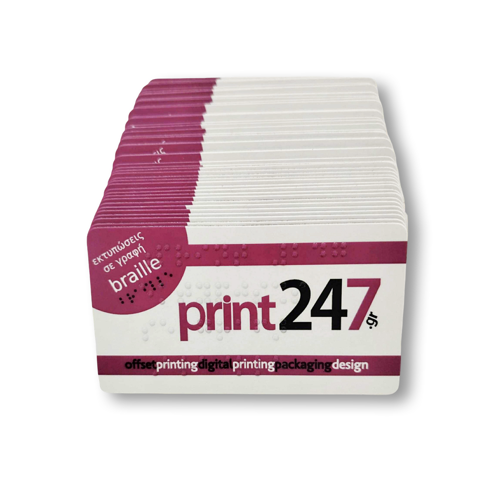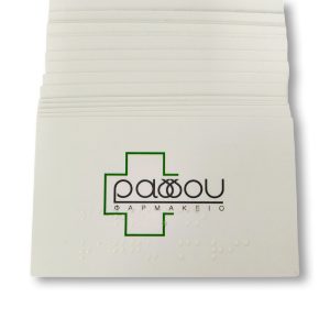 Η τύπωση γίνεται σε χαρτί velvet velvet 300gr έως 700gr με λογότυπο καθώς και γραφή Braille.