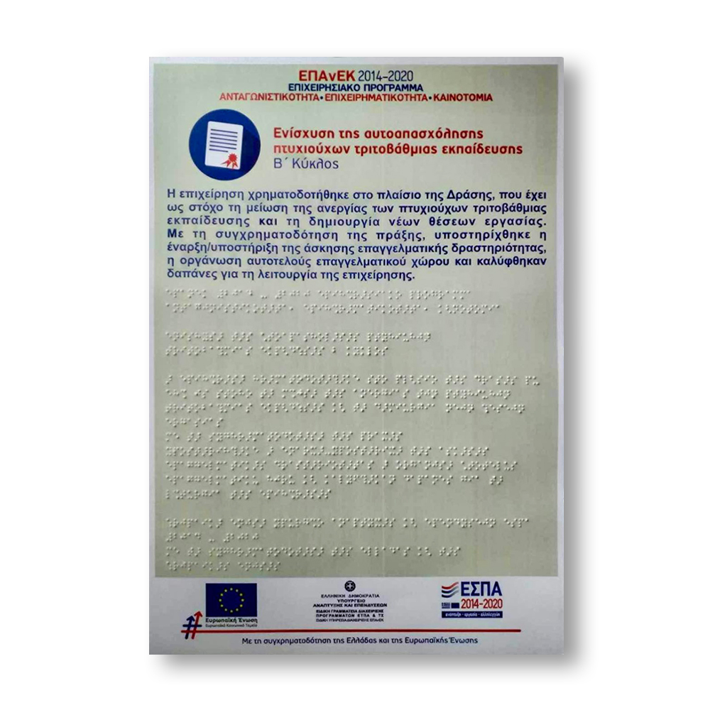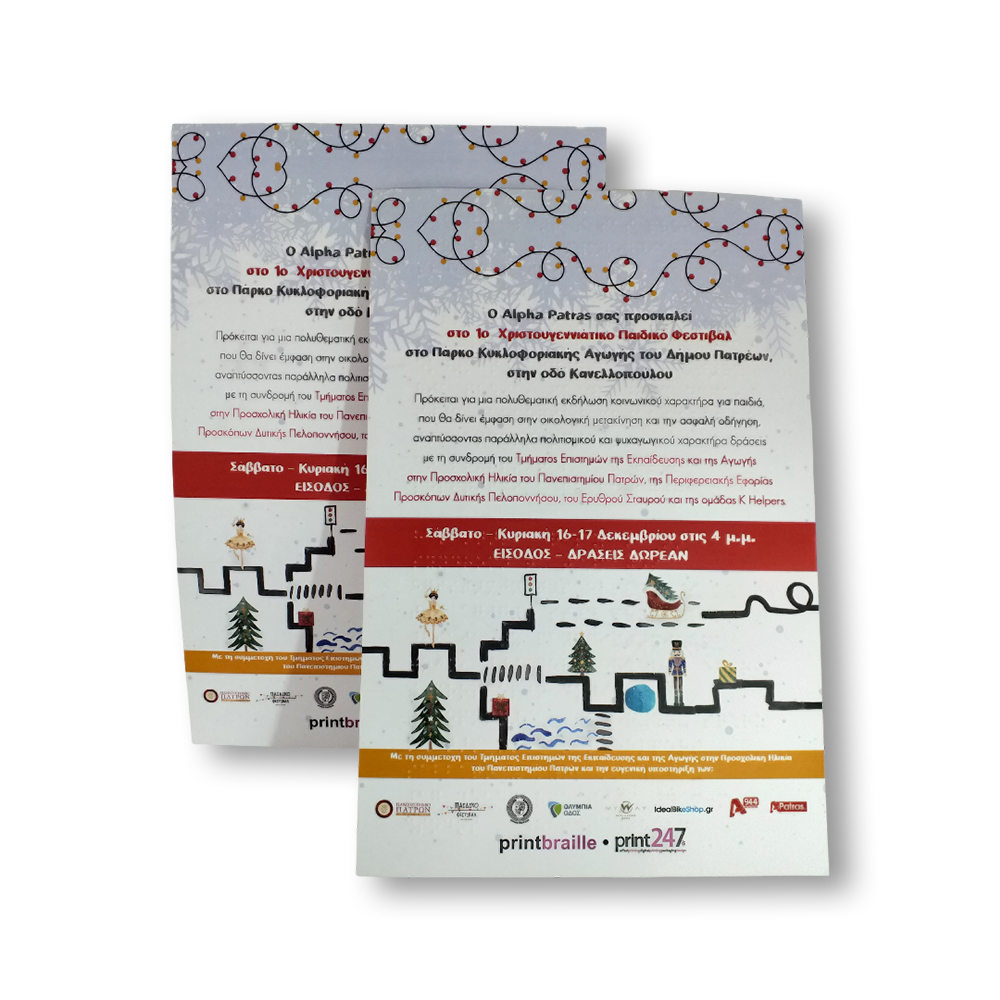 Προσκλήσεις εκδηλώσεων και συνεδρίων με δυνατότητα ταυτόχρονης εκτύπωσης σε braille και έγχρωμης εκτύπωσης για βλέποντες. Σχεδιάζονται και τυπώνονται βάσει των αναγκών της κάθε επιχείρησης.
